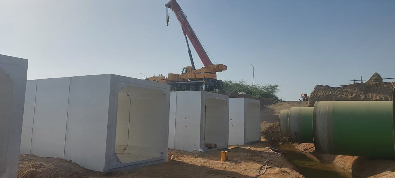 Sachi Precast Solutions executed the Tata Power Mudra project by delivering large-scale precast infrastructure components including box culverts, slabs, pipe racks, and beams. The project required advanced engineering solutions to overcome on-site construction limitations while meeting strict technical and operational standards.